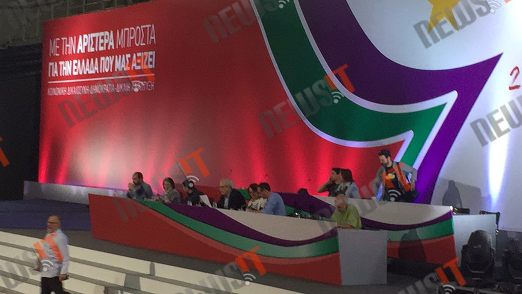 Ελάχιστοι άνθρωποι, μεγάλης ηλικίας, αρχίζουν να κάθονται. "Ελάτε να καθίσετε πιο μπροστά για να γεμίσουν οι θέσεις πριν ξεκινήσουμε τη συζήτηση", τους προτρέπει ο Αριστείδης Μπαλτάς, ο οποίος έχει αναλάβει να συντονίσει τον διάλογο. Όσο πιο μπροστά κι αν έρθουν ομως οι σύνεδροι δεξιά και αριστερά τους οι "σύντροφοι" βλέπουν άδειες καρέκλες.